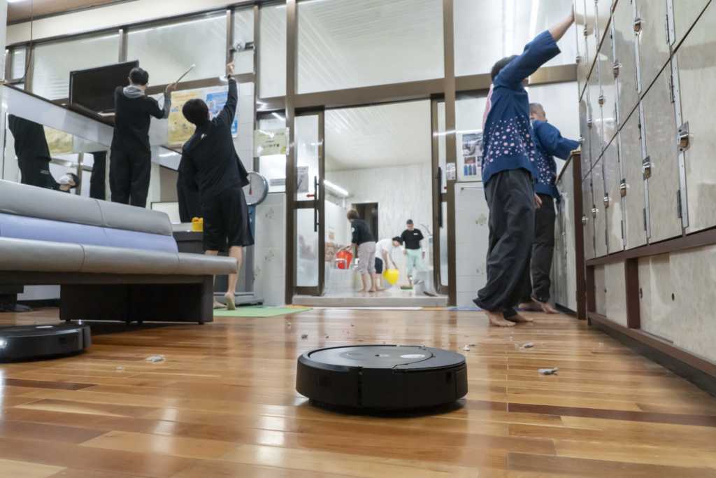 プロジェクト当日は、アイロボットジャパンの挽野代表とさくら湯の新保代表が開会挨拶を行い、銭湯運営の課題やロボット掃除機の可能性について語った。その後、ルンバ3台が脱衣所で活躍し、1年間たまったホコリや汚れを丁寧に除去した。通常では掃除が行き届かないベンチの下や隙間も、ルンバが水拭きと吸引を行い、床全体をきれいに仕上げた。