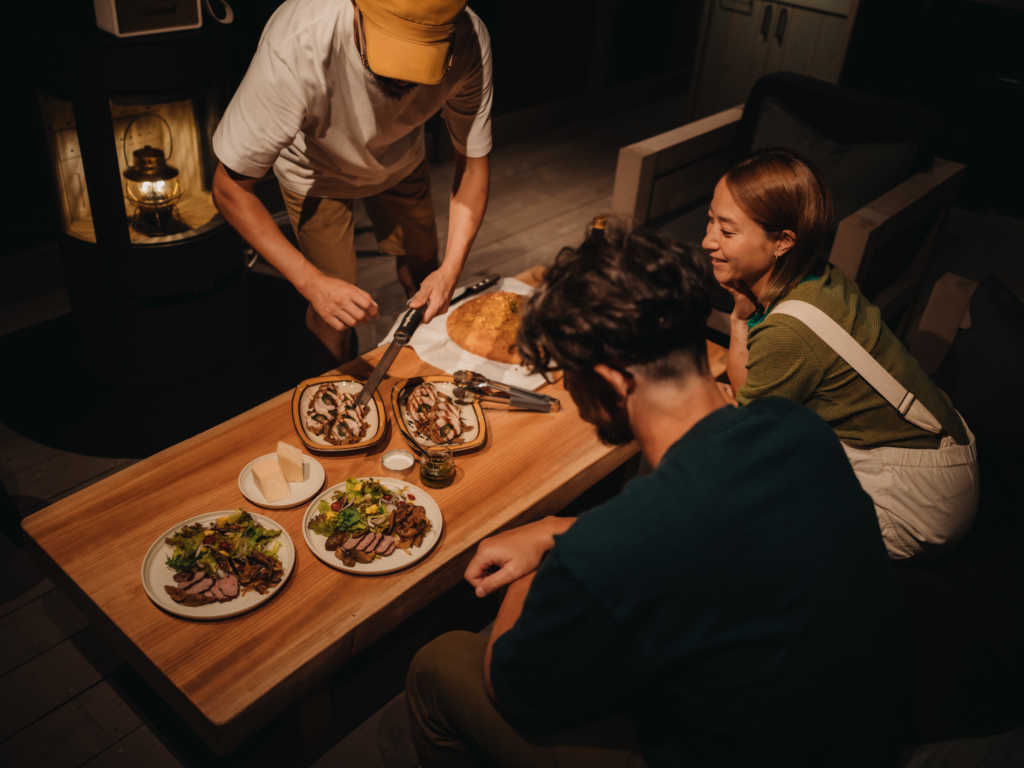「Tiny Base The MOUNTAiN」では、地元の食材を使った多彩な食事オプションが用意されている。宿泊者は好きな食材を持ち込むか、地物のBBQセットやしゃぶしゃぶセットを予約できる。さらに、イタリアンシェフによる出張ディナーやケータリングサービスも選べるため、特別なひとときを彩る食体験が可能だ。