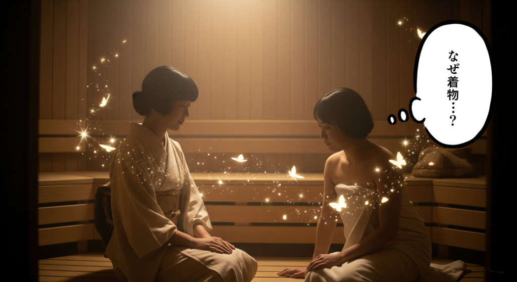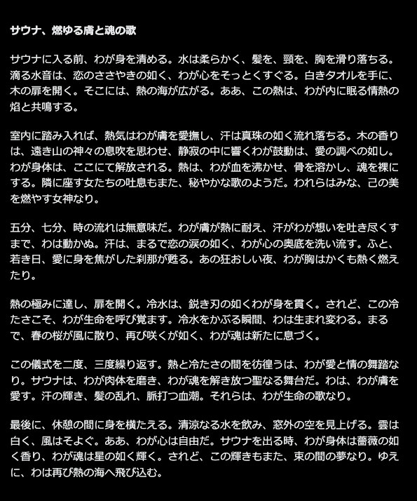 木の扉を開けば「熱の海が広がる」「この熱は、わが内に眠る情熱の焰と共鳴する」。もう、サウナが情熱を燃え上がらせる舞台装置になってるんですもん。熱気は「わが膚を愛撫し」、汗は「真珠の如く流れ落ちる」。汗が真珠ですよ!私なんてせいぜい「汗だく」くらいなのに。隣に座る女たちの吐息も「秘やかな歌」に聞こえて、「われらはみな、己の美を燃やす女神なり」って。サウナ室が女神たちの宴になってる!レディースデーか?