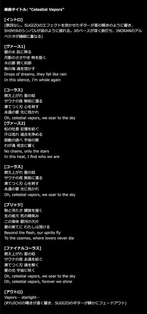 タイトルは「Celestial Vapors」。日本語訳すると「天空の蒸気」。この時点でいきなりヤバいオーラがムンムンです。イントロからSUGIZOのエフェクトギターが「星の瞬き」、SHINYAのシンバルが「波のように揺れる」。Jのベースが「深く脈打ち」、INORANのアルペジオが「繊細に重なる」。マジで聴こえてくるわ…。