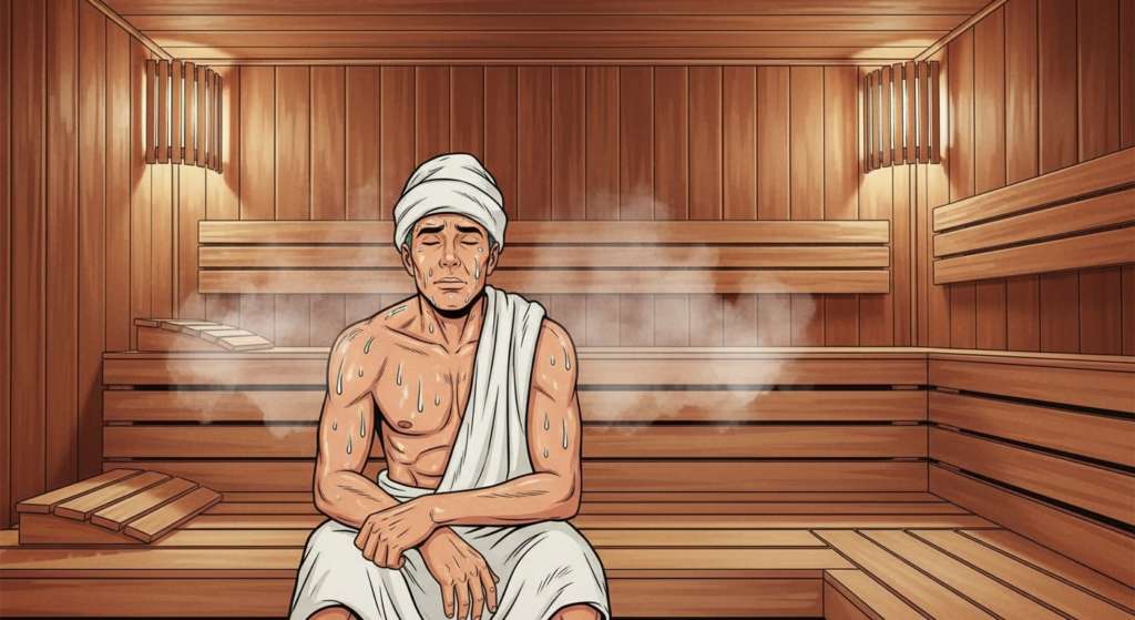 最上段に座るやいなや、ブーストドリンクの効果もあって全身に熱波が襲いかかる。体感温度は100℃。脳内で「血管拡張! 血流爆速!」と念仏のように唱える。3分経過したところで、脳内で「エクストリーム・セルフロウリュ!」と叫び、ストーブに水をぶちまけるイメージ。瞬時に立ち上る蒸気が、まるで核爆発の衝撃波のように全身を襲う。熱い! 痛い! そして、脳が揺れる。残りの時間もひたすら熱に集中する。