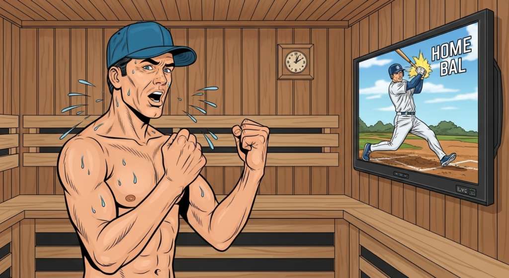 プロ野球や相撲、高校野球など、スポーツ中継で周りのサウナーと無言の連帯感を味わい、共に興奮する。「俺たちの汗が、勝利を呼ぶんだ…!」