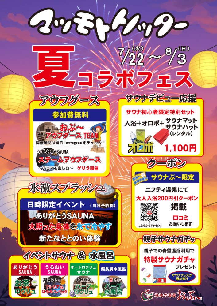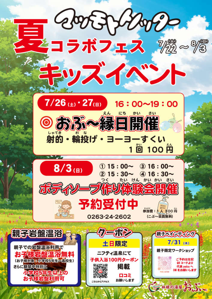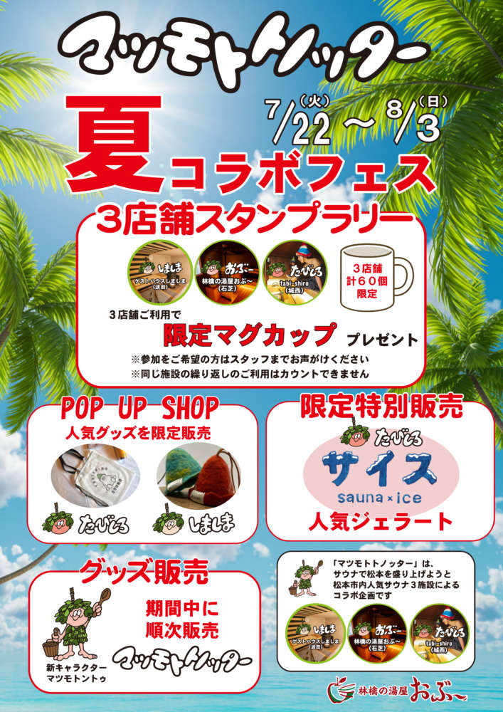 「マツモトトノッター」の参加施設である林檎の湯屋おぶ~では、7月22日から8月3日までの期間、「マツモトトノッター夏コラボフェス」を開催する。