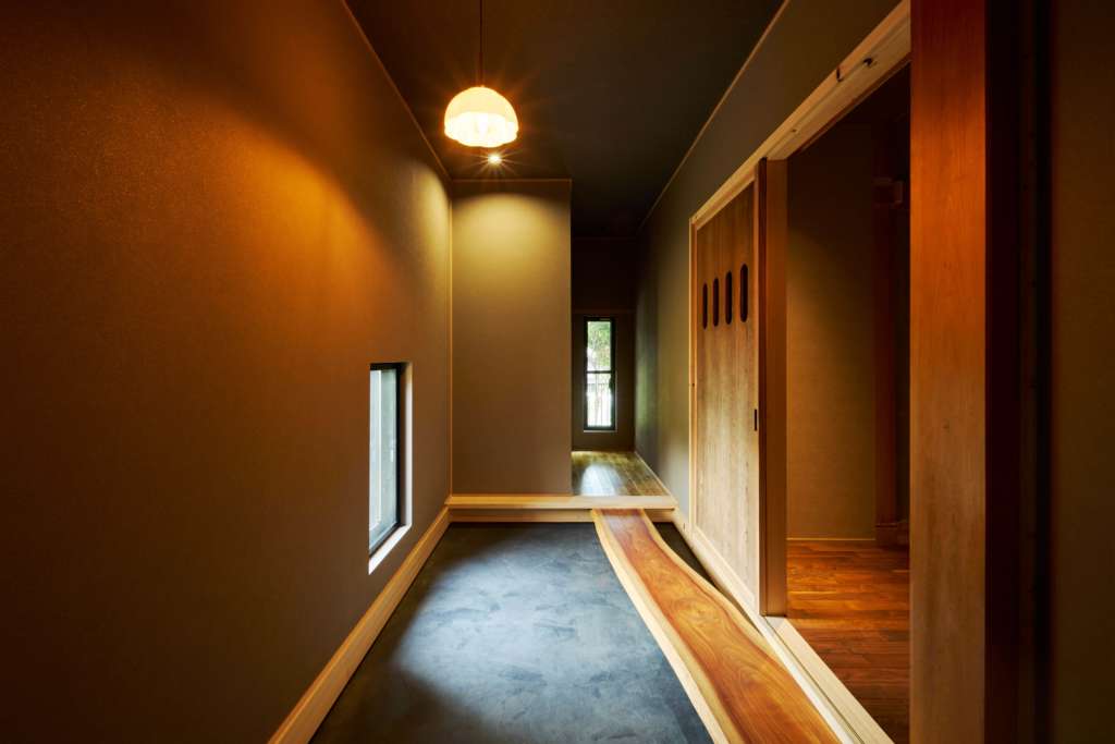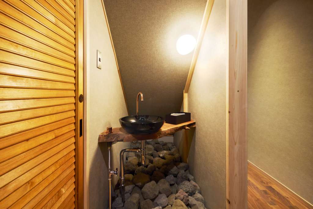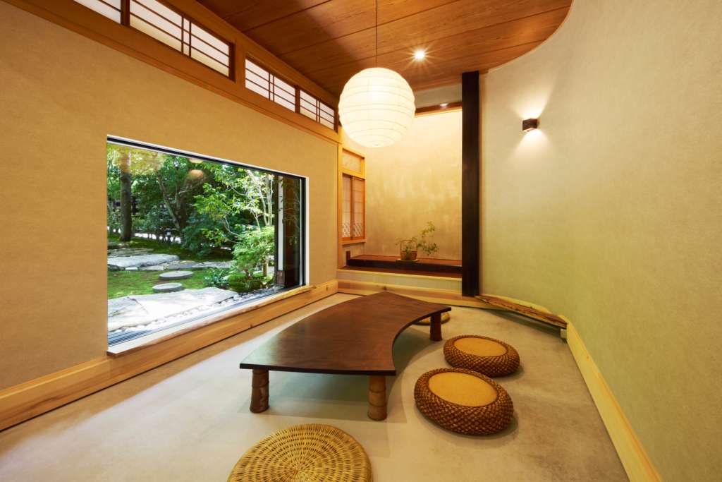 施設内は現代の縁側のような”土間リビング”を採用し、屋内にいながら庭とのつながりを感じられる設計となっている。素足で感じる土間のひんやりした肌触りと無垢材のぬくもりが、五感を心地よく刺激する「非日常」を演出する。