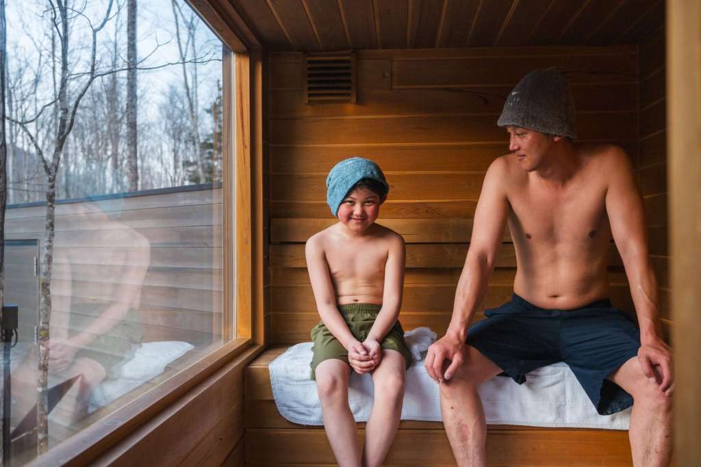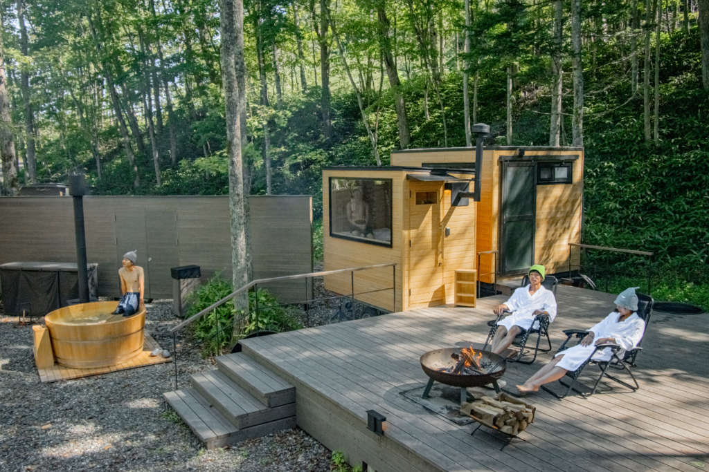 同施設の最大の特徴は、各宿泊棟に併設されたプライベートサウナだ。薪式ドライサウナでは利用者が好みの温度に調整でき、セルフロウリュも楽しめる。森の息吹を感じられるアロマも用意されており、リラックス効果を高めている。