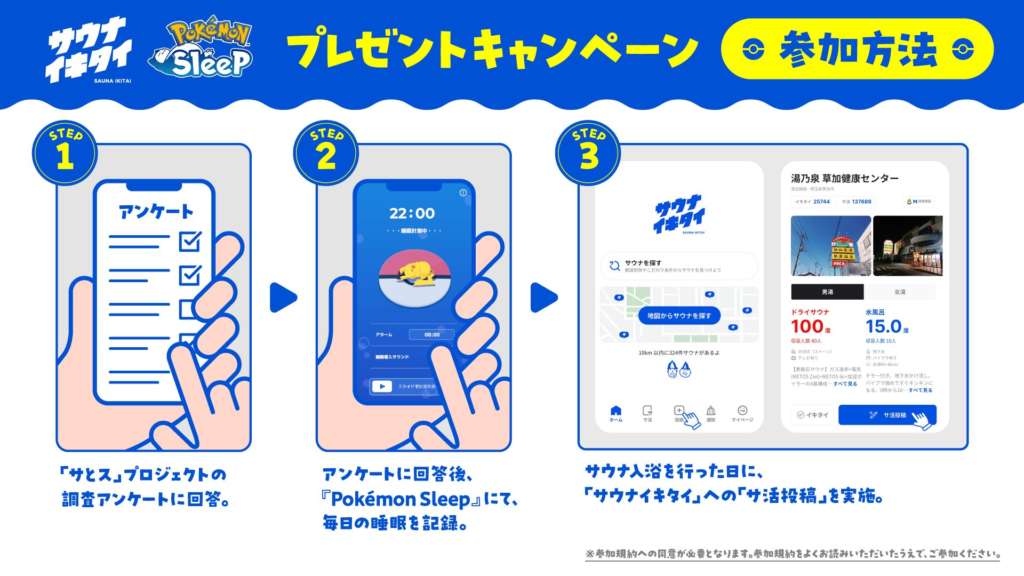 プロジェクトでは、参加者にアンケートへの回答、『サウナイキタイ』への「サ活(サウナ活動)」の投稿、『Pokémon Sleep』の睡眠計測データの収集を通じて、サウナと睡眠の関係性を多角的に分析していく。