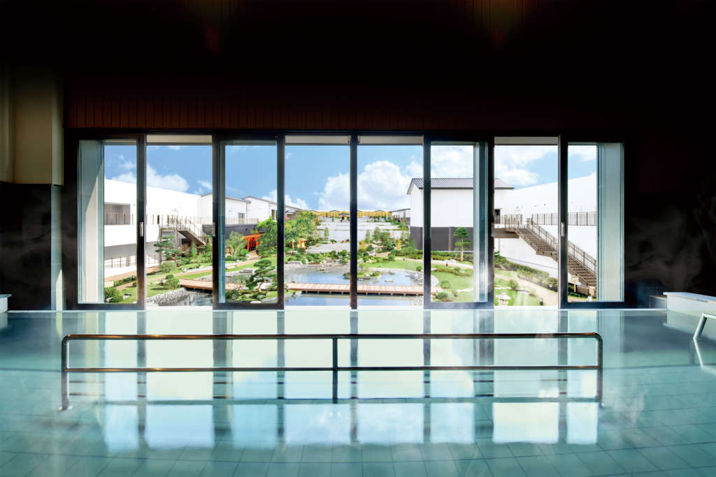 約5,000坪の広大な敷地に天然温泉の露天風呂、9種類のお風呂、屋上日本庭園などを備える関西最大級の温泉型テーマパーク。無料アメニティ充実で手ぶら来館が可能だ。