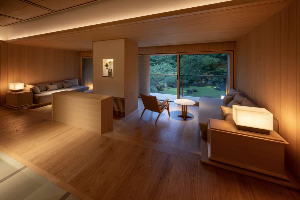 強羅花壇は2025年8月、箱根の大自然に抱かれた新たな客室「別邸 東雲(しののめ)」を開業した。約250㎡の広大な空間に、プライベートサウナをはじめとする極上の設備を備えた、同館を代表する最上級の客室だ。