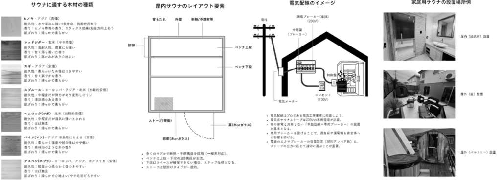 • 種類別解説:屋外型(バレルサウナ、テントサウナ、小屋型)、屋内型などタイプごとの特徴