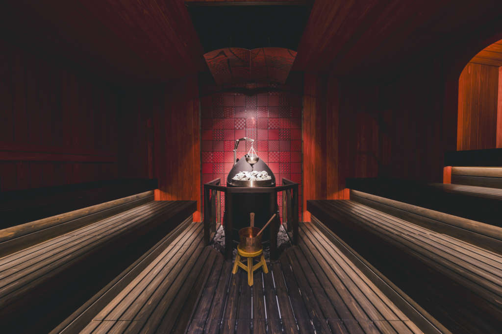 黙浴専用のサウナ室「もくもく」は、関西初導入のEOS社製「ZEUS」サウナヒーターを搭載。室内は静寂を楽しむ”黙浴”専用で、落ち着いた照度に設定されている。セルフロウリュによる音や蒸気、湿度の変化に集中できる特別な空間となっており、赤を基調とした個性的なデザインに、ストーブ上のハーブポットが心地よい香りを演出する。