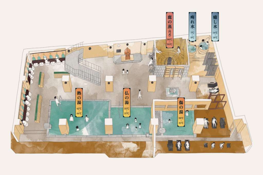 施設内には鹿の湯のほか、和の華やかな設えが美しい花もみじ(77室)も併設されている。また中央部には卓球ラウンジや屋外プールなど、温泉・サウナ以外にも滞在を彩る多様な施設が充実している。