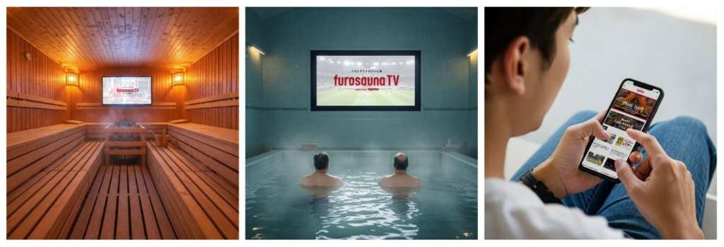 フロサウナTVは、温浴施設やサウナ室に設置したデジタルサイネージを通じて、サウナ利用者に向けたオリジナルコンテンツや番組を配信する新しいメディアだ。当WEBメディア「フロサウナ」とクロスメディア展開することで、オンラインとオフラインを融合させた「お風呂とサウナのテレビ局」という、これまでにない情報発信の形を実現している。