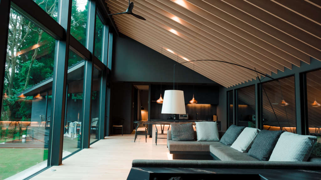 Mt.1は、カルデラの広大な景色と建築美を存分に楽しむことができる棟で、最大8名まで宿泊可能だ。大きな窓や開放的なテラスから阿蘇の山並みや四季折々の自然が室内に取り込まれ、どの角度からも借景のように景色を楽しめる。建物自体も自然に溶け込むデザインで、自然と一体になったひとときを過ごせる。