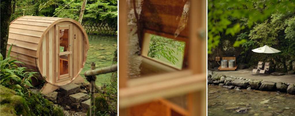最大の目玉は、従来の川辺のテントサウナに代わって導入された「ONE SAUNA」のバレルサウナだ。鳥取県産の智頭杉で組み上げられたこのサウナは、狩野川沿いに佇み、サウナ室の小窓から天城の清流を望む設計。透明度の高いせせらぎに耳を澄ませながら、四季折々に移ろう山肌を眺める外気浴が楽しめる。一年を通じて利用可能で、自然との一体感を味わえる日本でも稀有な体験を提供する。