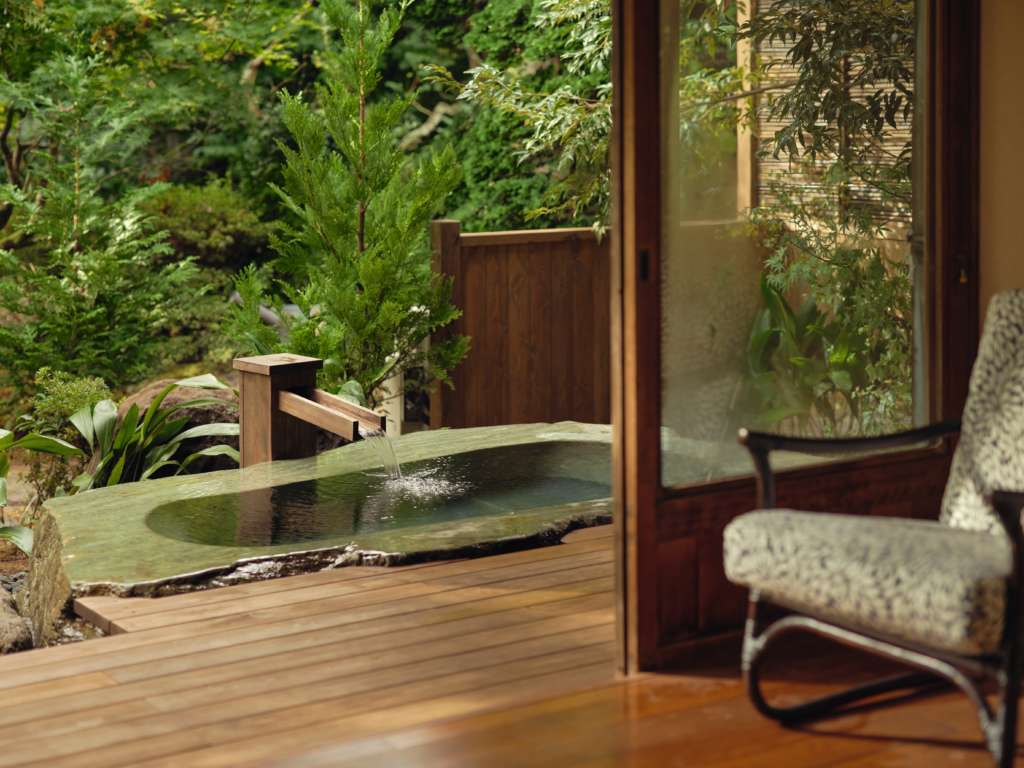 サウナ施設以外にも、和洋室「紅梅」と「常夏」に露天風呂を新設。「常夏」には徳島産「阿波の青石」の岩の塊(4t)からくり抜いて削り出した2.5tの源泉掛け流しの岩風呂を、「紅梅」には木曽石(2t)を使用した露天風呂を設置した。