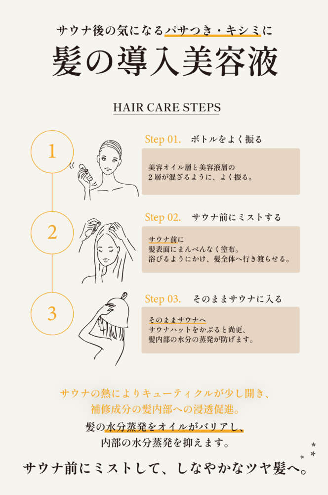イベントの主役は、ブランドのシグネチャーアイテムである二層式ブースターヘアミストだ。サウナ前にひと吹きするだけで、高温のスチームによってキューティクルがやわらかく開き、加水分解ケラチン・コラーゲン・シルクといった補修成分が髪の内部までしっかりと浸透する仕組みとなっている。