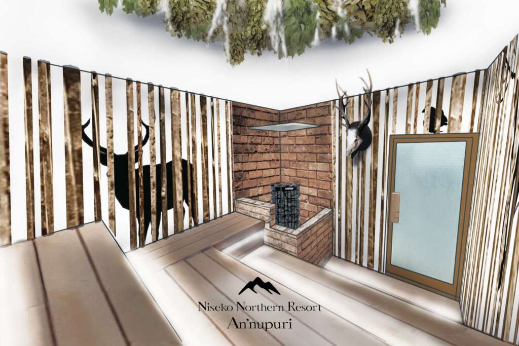 リニューアルしたサウナの最大の特徴は、北海道・ニセコを代表する動植物が浮かび上がる独特の内装だ。まるで北海道の森を木々の隙間から覗いているかのような空間デザインを採用。天井には白樺ヴィヒタが贅沢に配され、大自然を感じながらサウナを楽しめる。