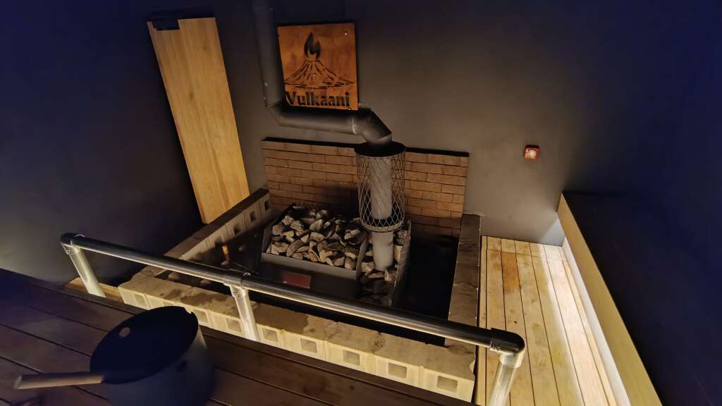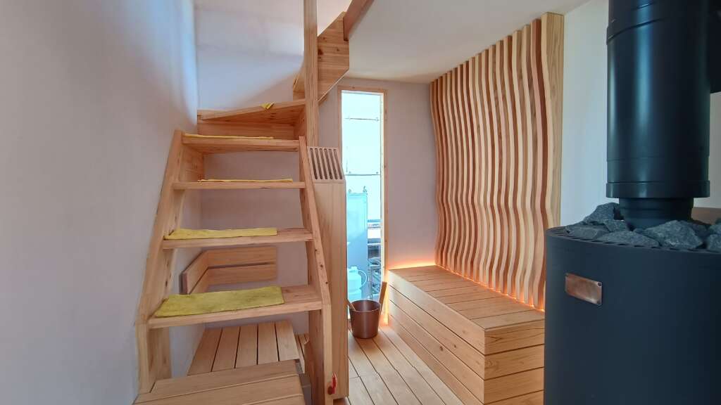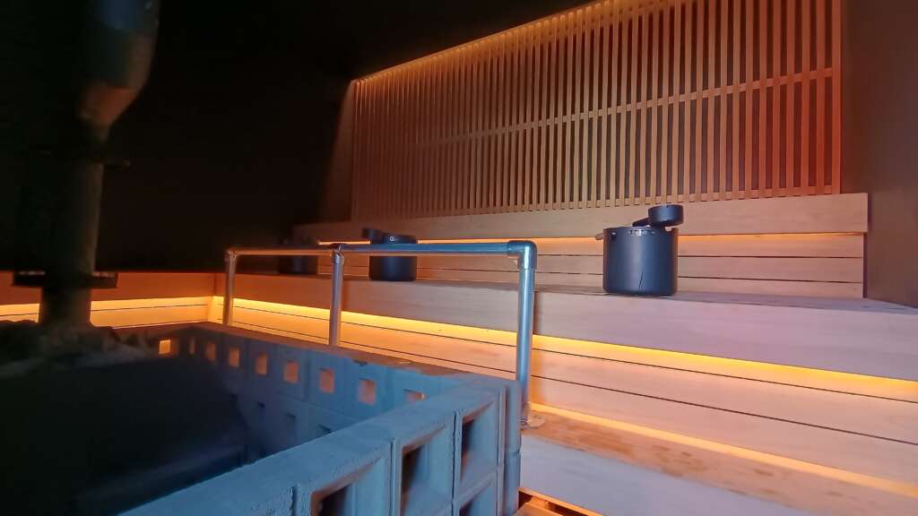 岐阜発の本格フィンランド式。炎を見ながら「ととのい」を提供してくれる。ロウリュも本場フィンランドスタイルで、ラドルから水をストーブに向かって投げかけるスタイル。広めの室内は12人くらいは入れそう。