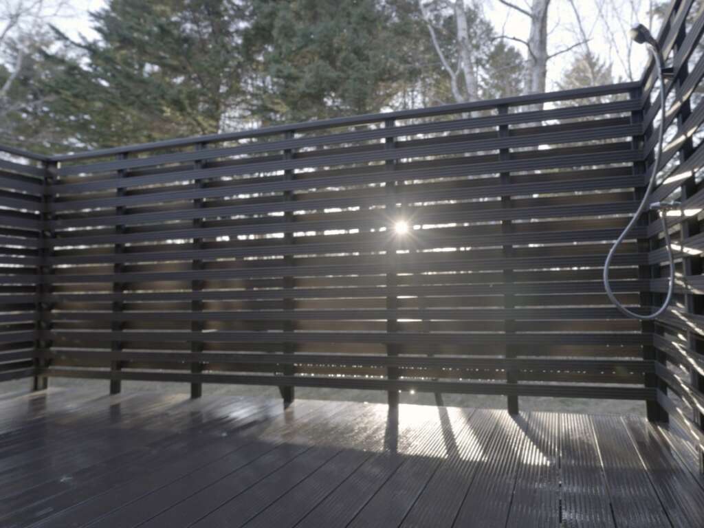 また、サウナ前後の休憩・外気浴スペースにもこだわりが見られる。特に男性用サウナには、森林浴も楽しめる外気浴スペースを設置。北海道の清々しい自然風を感じながらととのうことができる環境だ。