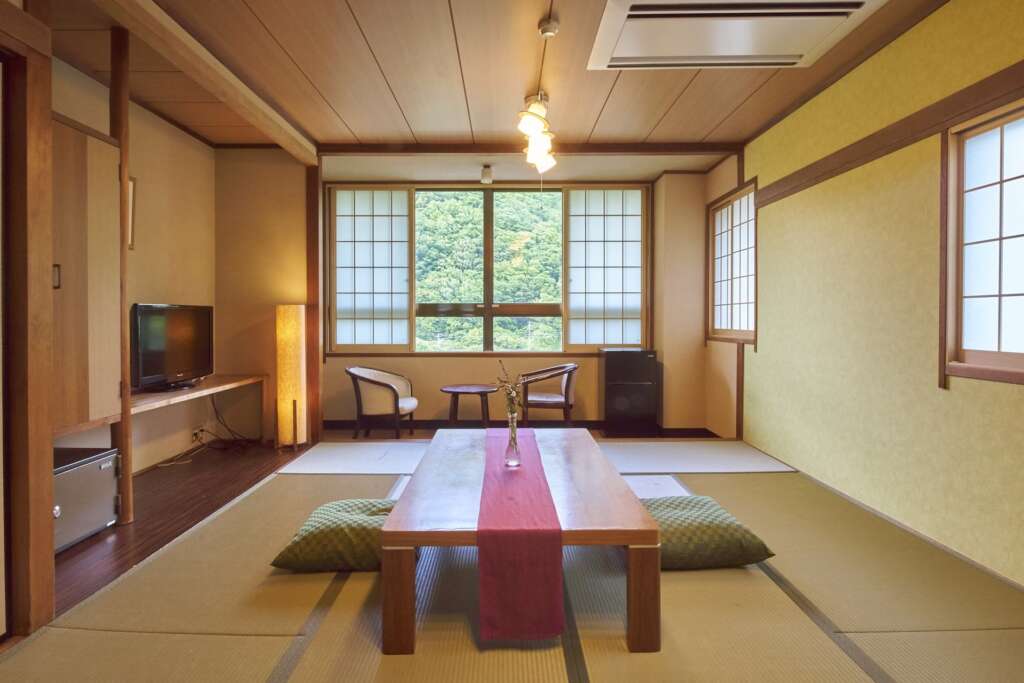 客室は全6タイプを用意。さらに、名水をテーマとした食事も提供している。館内には卓球や宴会場、会議室なども備わっている。