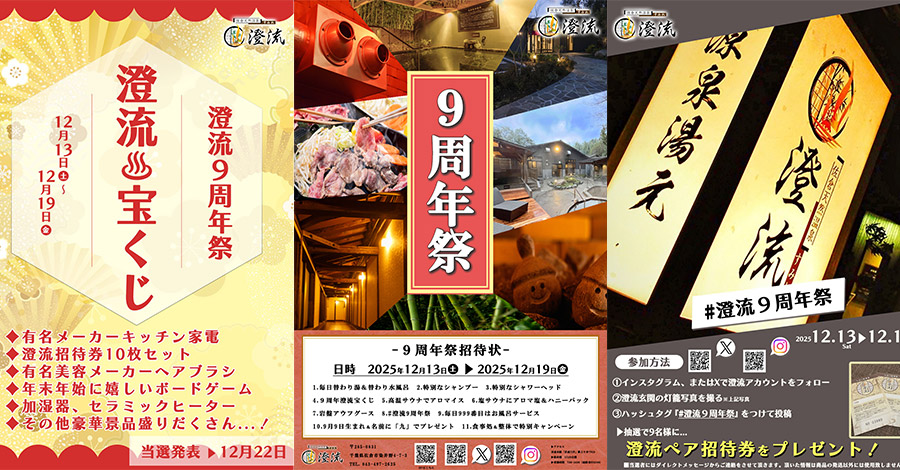 入浴客全員に「澄流9周年祭宝くじ」を配布する。豪華家電製品や美容器具、食品、澄流招待券などが当たるチャンスだ。当選発表は12月22日にSNSやホームページ、館内掲示で行われる予定である。