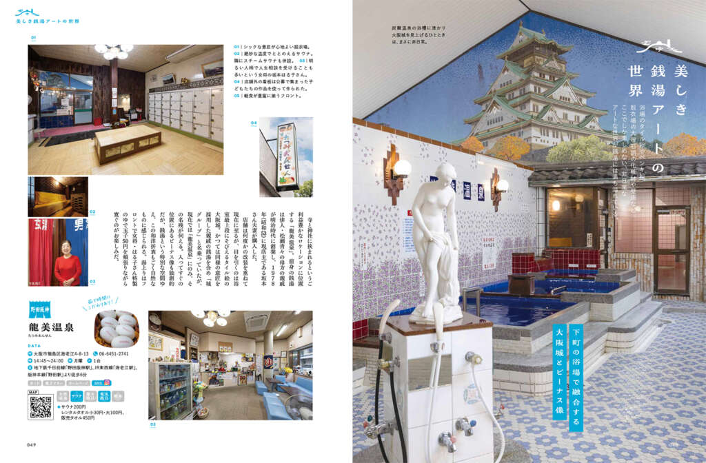 特集では「美しき銭湯アートの世界」「番台の笑顔に魅せられて」「スタイリッシュな空間でととのう」「センター浴槽&えんがわが大阪やねん」「眺めのいい露天風呂へ」「肌がうるおう温泉銭湯」「五感で楽しむ個性派銭湯」「近隣飲食店でさらにほっこり」といった充実の内容となっている。