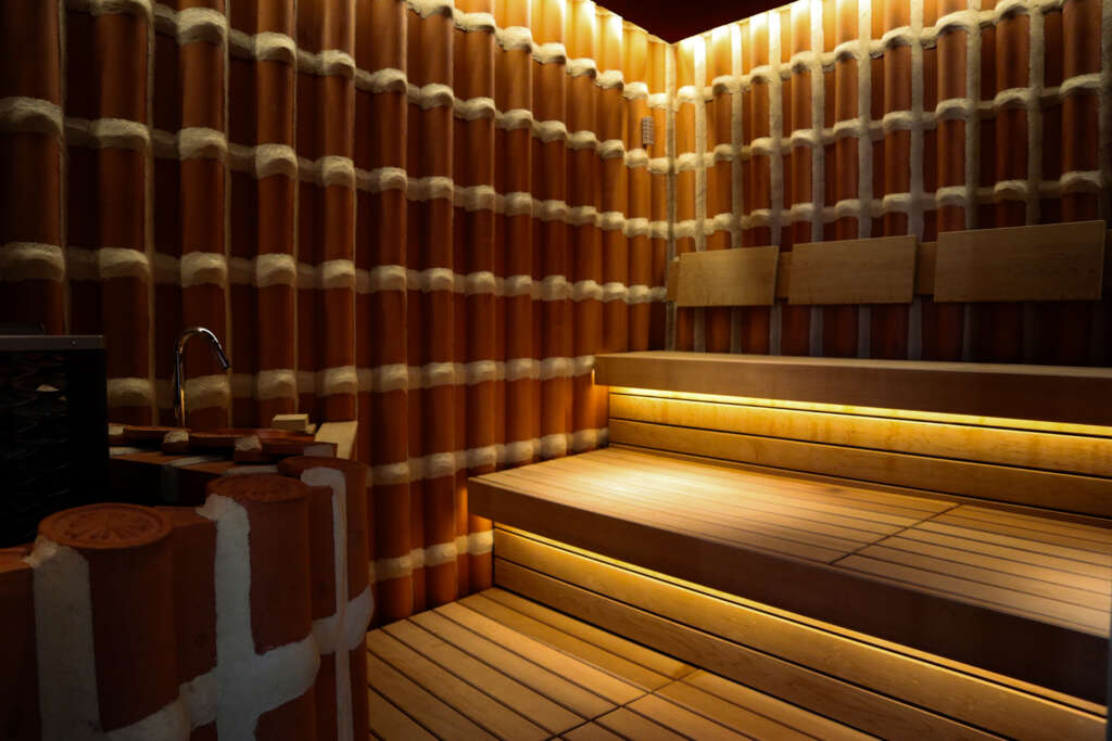 男性浴場サウナ室は、沖縄の伝統的な建築物に使われている「赤ガーラ(赤瓦)」をイメージ。落ち着いた赤を基調とした空間で、温もりと力強さを感じるデザインだ。