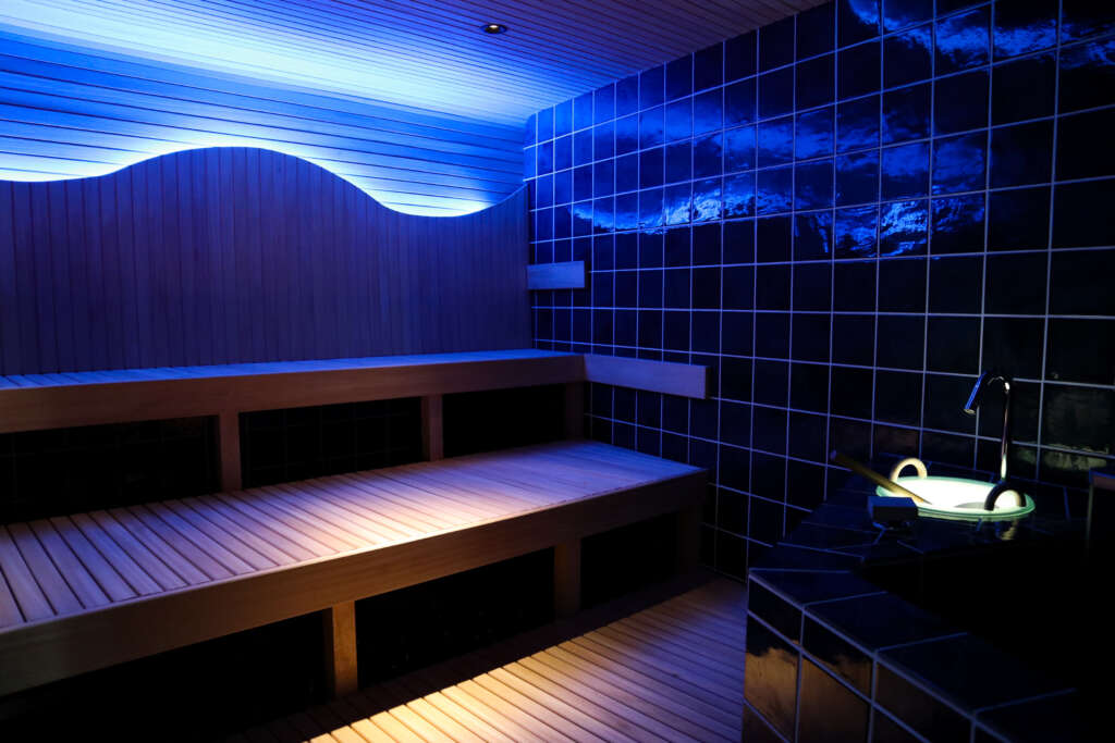 また、夜にはホテルロゴのネオンライトがやさしく灯り、思わず写真に収めたくなる空間を演出。リゾートサウナを最後まで堪能できる設計だ。