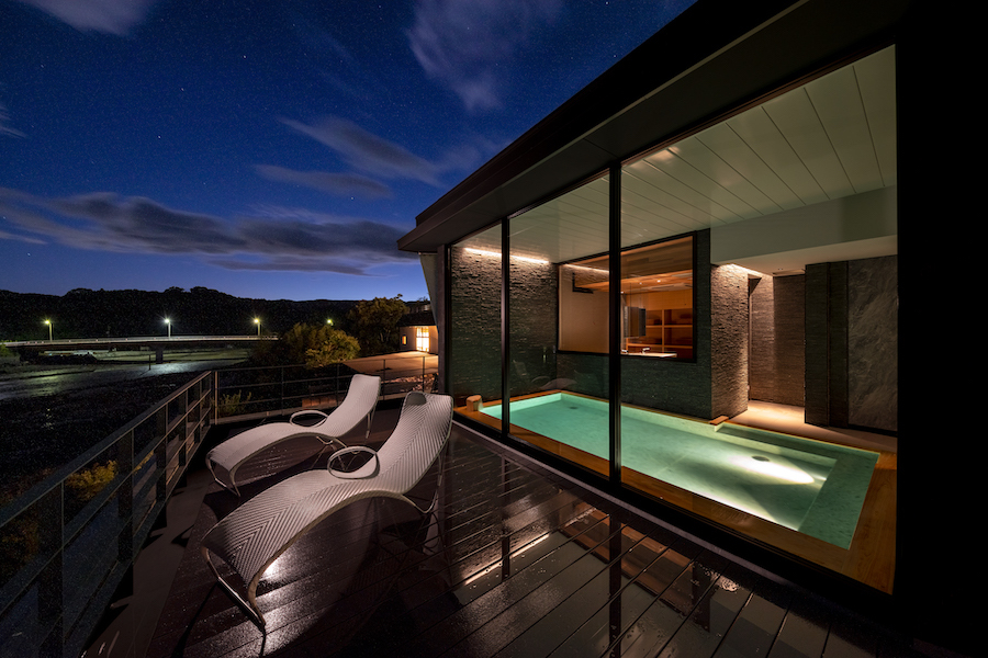 中でも注目は、水を感じさせる光の照明「BeWater lamp」を配した客室。まるで水中を漂うような特別な空間で、非日常のひとときを過ごせる。また、大きく張り出したデッキに浮かぶように作られた半露天風呂も人気だ。