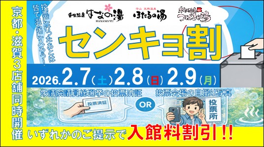 朝陽物産株式会社が運営する3つの温浴施設で、衆議院議員総選挙に合わせた画期的なキャンペーンが始まる。「壬生温泉 はなの湯」(京都府京都市中京区)、「守山天然温泉 ほたるの湯」(滋賀県守山市吉身)、「水口温泉 つばきの湯」(滋賀県甲賀市水口町)の3施設が、衆議院議員総選挙に合わせた『センキョ割』を実施。投票済証や投票会場の自撮り写真を提示すれば、入館料600円で利用できるお得な企画だ。