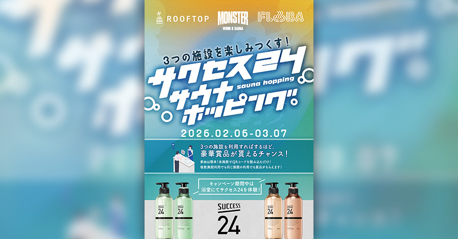 花王株式会社の若年男性向け頭皮スキンケアシリーズ「サクセス24 シャンプー・コンディショナー」が、中央線沿線の人気サウナ3施設とコラボレーション。2026年2月6日(金)から3月7日(土)まで、施設周遊型キャンペーン「サクセス24サウナホッピング」第2弾を実施する。