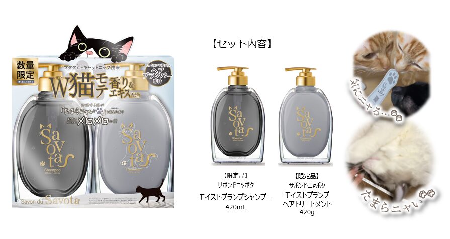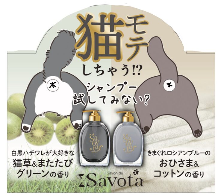 同社は「めんどくさいを応援する」をコンセプトに掲げるサボンドサボタの限定品として、10匹中6匹が「たまらニャい」と反応した香りを用いたヘアケアシリーズ「サボンドニャボタ」を発売。思わずお風呂に入りたくなる要素として、「猫にモテる」に着目した点が特徴だ。