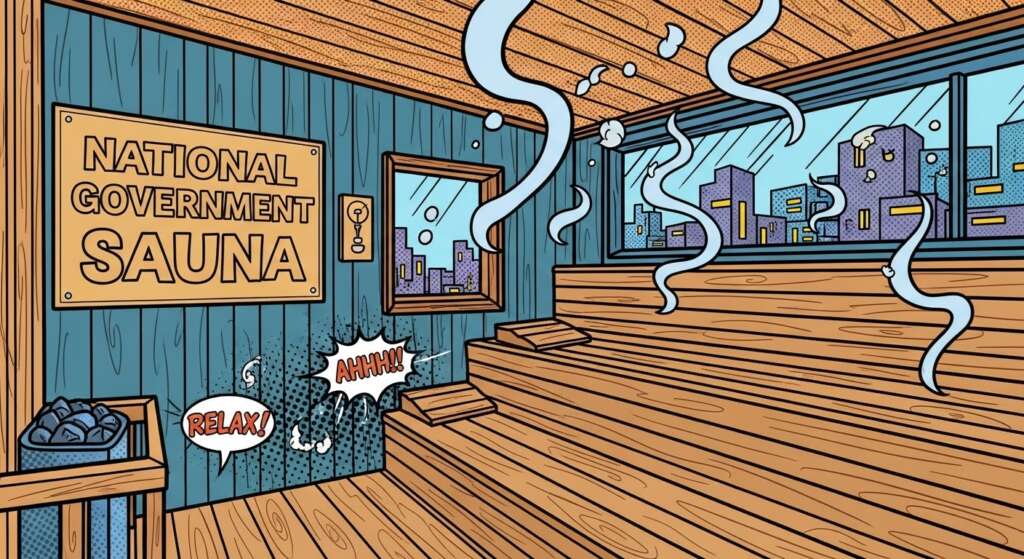 - 投票率80%突破: ついに「国立サウナセンター(通称:国サ)」が建設。国会議事堂の隣に、最高級のケルケスストーンを使用した巨大サウナが誕生し、総理大臣と野党党首が裸でロウリュを交わしながら討論する。