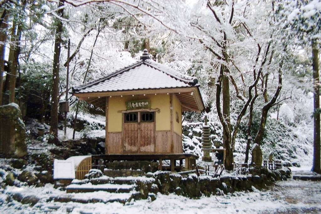 鶴仙渓遊歩道のほとりに佇む、芭蕉を祀った御堂。ここからの景色を眺めて、芭蕉は「行脚の楽しみここにあり」と手を叩いて喜んだとか。現代のサウナーなら「サウナの楽しみここにあり」と叫ぶポイントです。