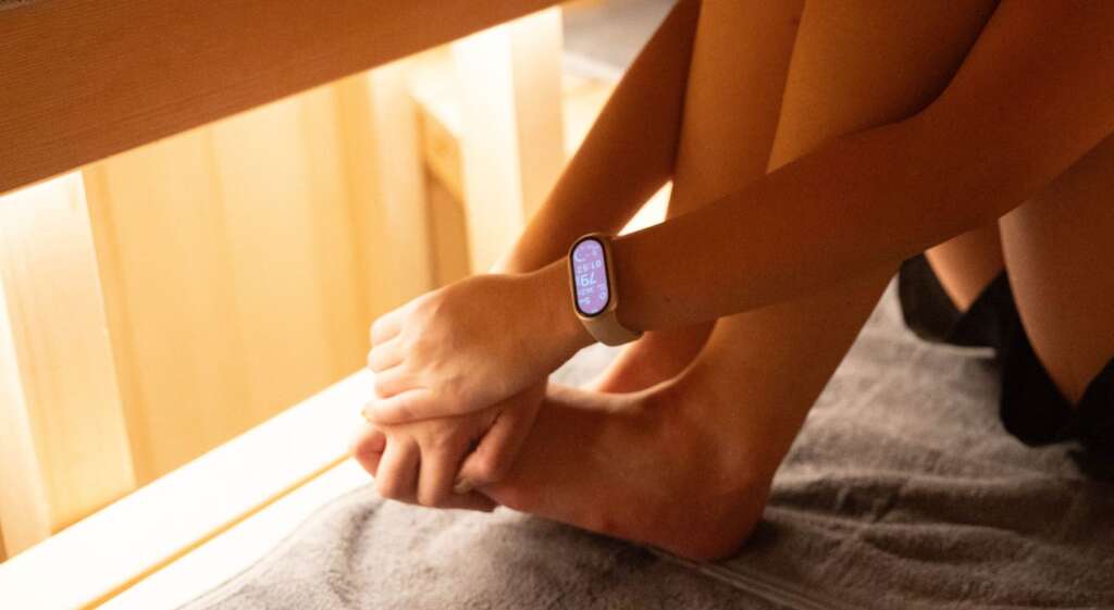 視認性に優れた高解像度AMOLEDディスプレイを採用。サウナ室内の明るさや屋外環境でも、必要な情報をはっきりと確認できる。また、サウナ室内ではディスプレイの明るさを抑えることもでき、暗い空間で画面が不必要に光らないようコントロール可能だ。