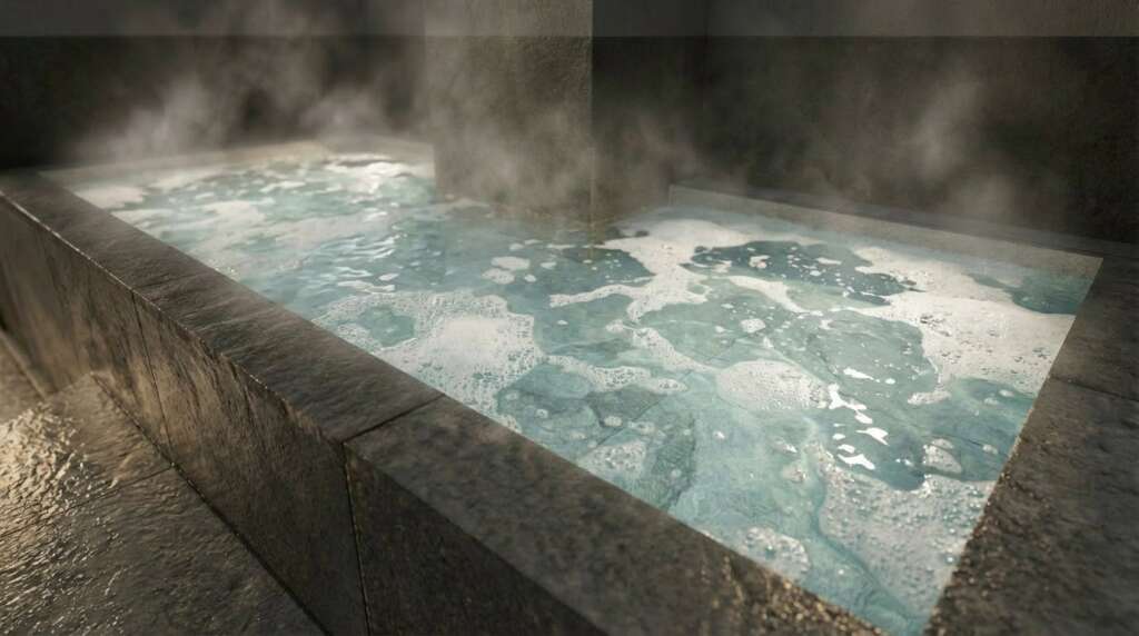 一撃の強冷と、包み込む柔冷。2種の美泡水風呂を用意し、さらに1時間に3回の高頻度水循環で清冽さを維持する。そのため、冷冷交代浴による独特の温感体験が可能となる。