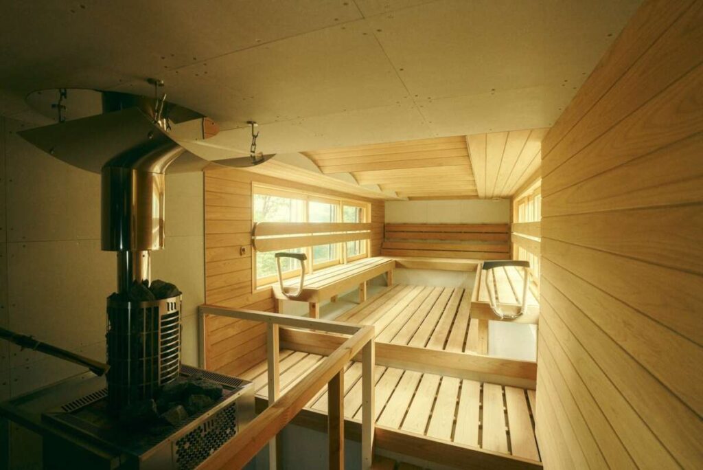 扉を開けた瞬間、薪の熱と湿度が静かに広がる。そして次の瞬間、車内にはライブ音源が響き渡る。まるでスタジアムの熱気がサウナの中に再現されたかのような空間だ。