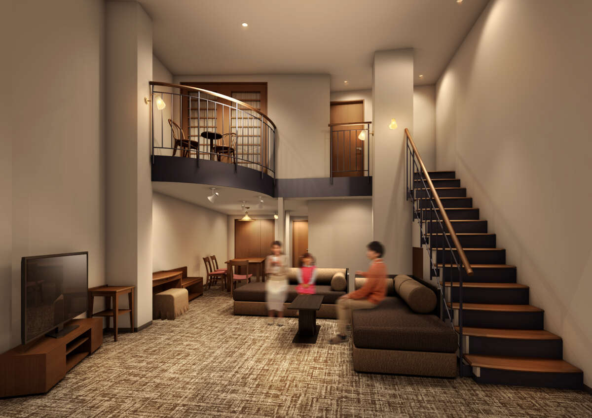 温浴以外のリニューアル内容も充実している。客室では「メゾネットフォース」が刷新される。客室内に階段を配した二階層のメゾネットタイプで、面積は101㎡。独立したツインルームを2室備え、最大5名まで宿泊可能だ。三世代旅行やグループ旅行に対応できる間取りは、北アルプスを望む高原リゾートならではのゆとりある滞在を提供する。