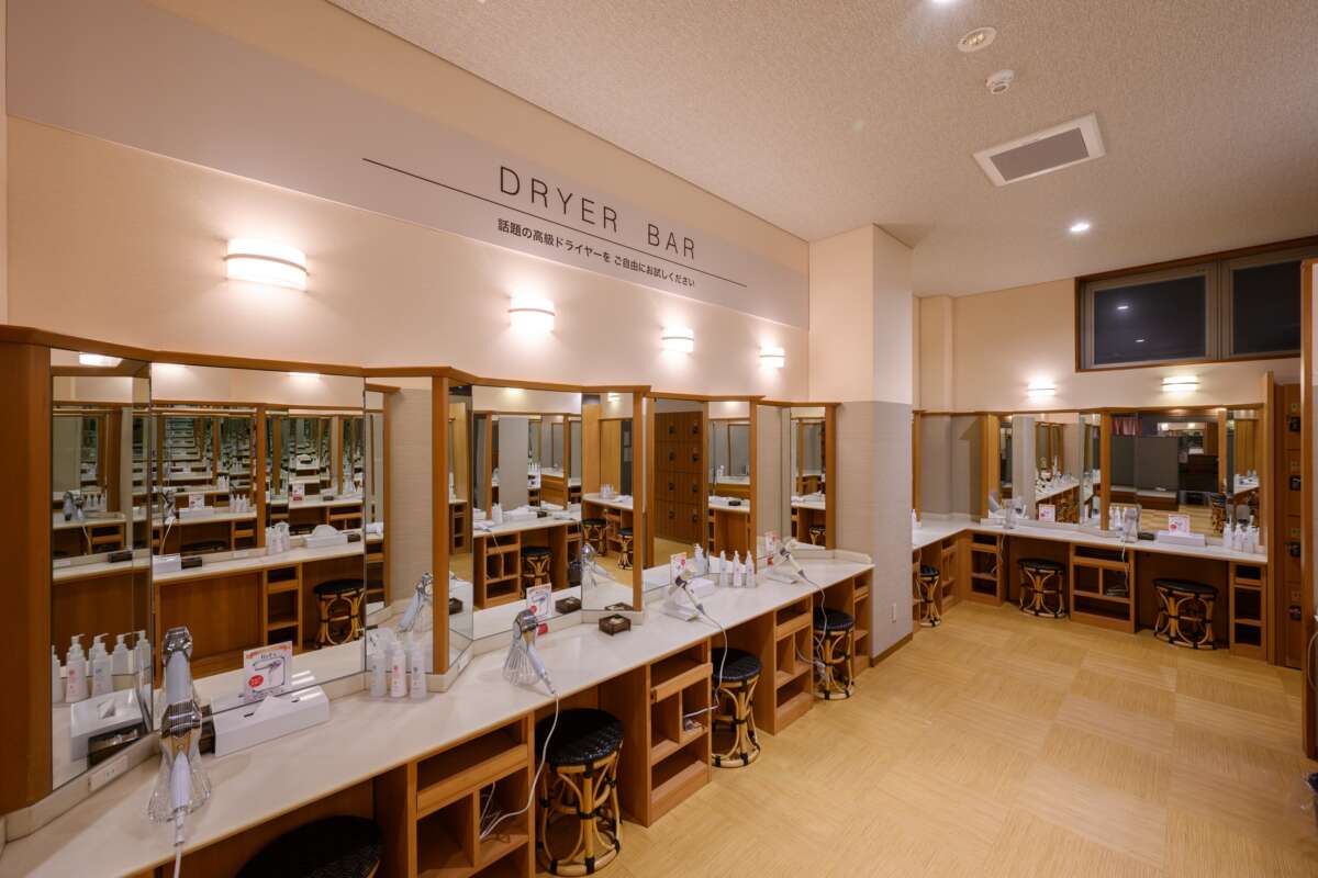 女性パウダーコーナーには、人気ブランドの高機能モデルを無料で試せる「ドライヤーバー」を設置。さらに女性大浴場内の洗い場の一部には、ReFaおよび絹女〈KINUJO〉のシャワーヘッドを導入し、入浴中から入浴後まで美容ケアを存分に楽しめる環境が整った。