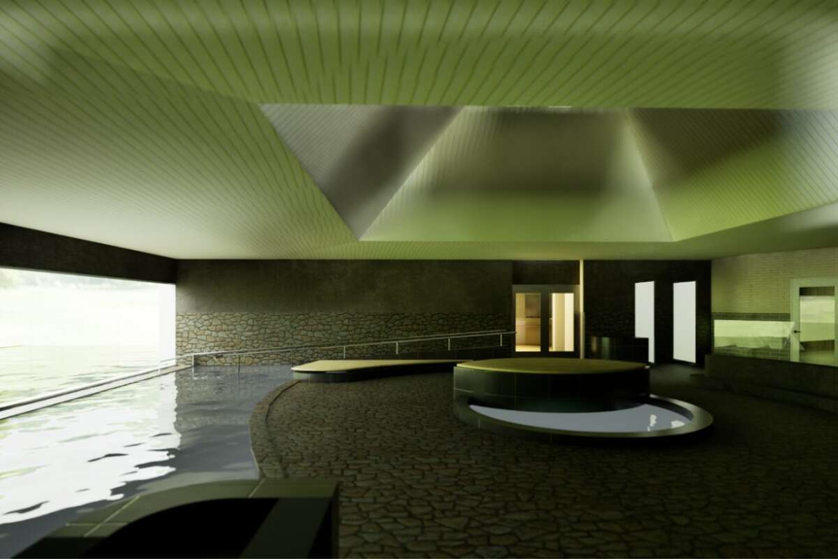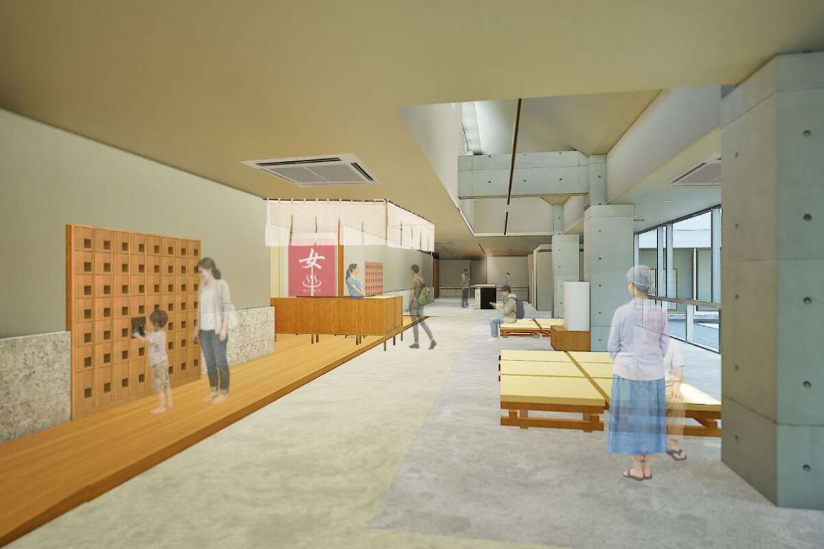 施設の空間コンセプトは「まちの縁側」。 エントランスホールを外に開かれた縁側的空間として再設計し、畳の大広間・バーカウンター・庭を緩やかにつなげることで、「お風呂だけ入って帰る」場所ではなく、滞在・飲食・交流が自然に発生する場を目指している。番台は残し、温泉を活用した浴室環境は既存設備を生かしながら刷新するという。