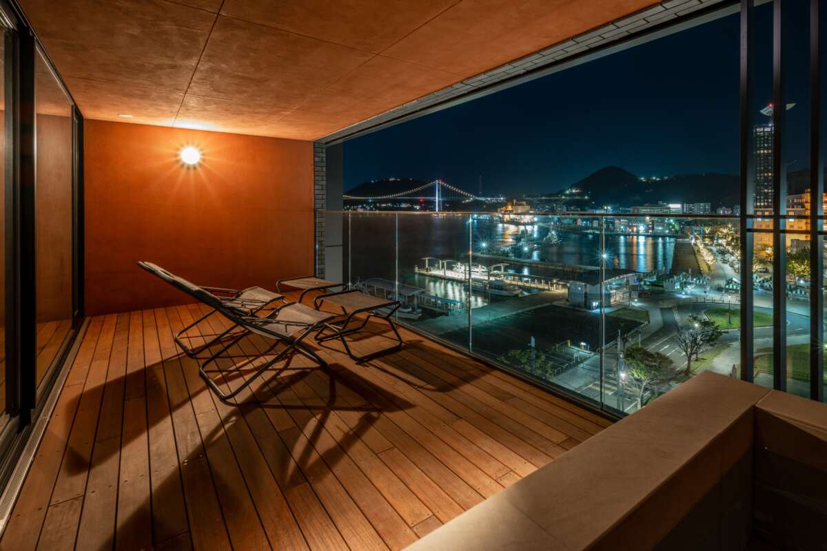 室内にはセルフロウリュ対応の本格ドライサウナを設置。複数のアロマから好みの香りを選べる仕様で、ロウリュの自由度が確保されている。バルコニーには水風呂と外気浴チェアを用意し、関門橋を正面に見ながらのクールダウンが可能だ。